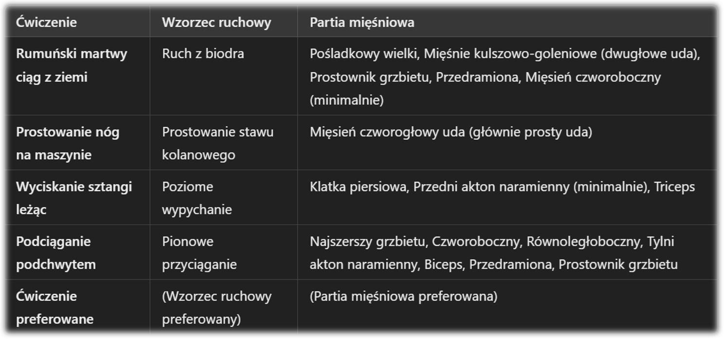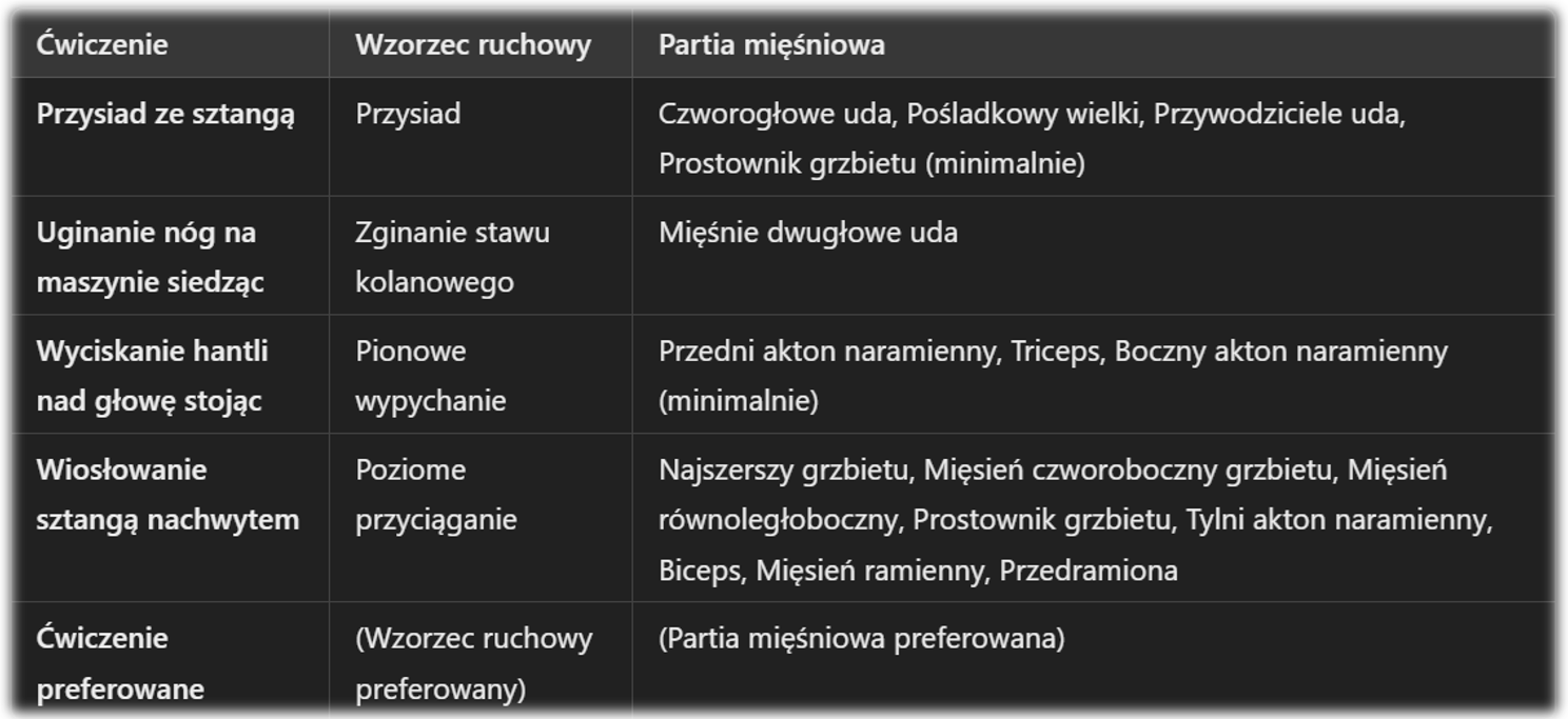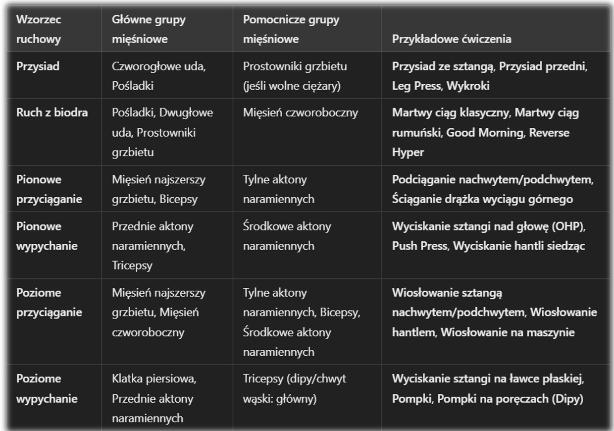 🔹 Fundamentem planu siłowego powinien być poniższy schemat, który zapewnia kompleksowe podejście do przepracowania głównych grup mięśniowych.